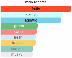 The fragrance opens with a burst of fresh, fruity notes of kiwi, pink pepper, and rhubarb, creating an energizing and vibrant introduction. At its heart, jasmine, cyclamen, and watermelon bring a soft floral and aquatic touch, adding a cool, refreshing dimension. The base is balanced and sensual, with a warm blend of musk, sandalwood, and cedarwood, leaving a lasting impression of elegance and sophistication.