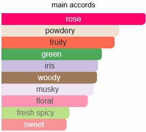 The fragrance opens with a luminous blend of Turkish rose, May rose, and Bulgarian rose, creating a vibrant and romantic floral bouquet. At its heart, the airy freshness of iris and violet adds depth and refinement, enhancing the delicate floral notes. The base is smooth and sensual, with cedarwood, musk, and peppery hints, leaving a soft yet lasting trail of elegance.